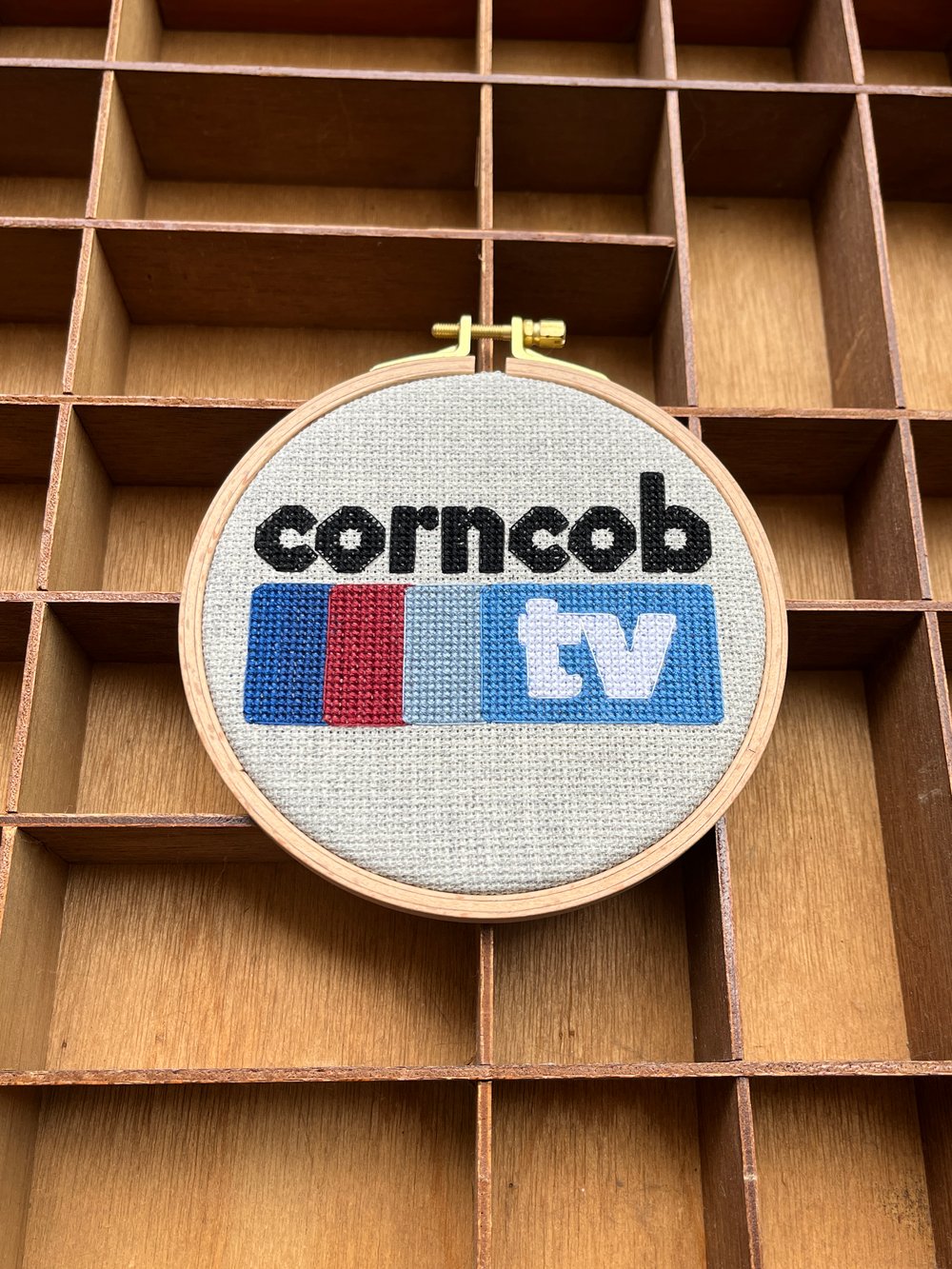 Corncob TV logo cross-stitch on light grey aida framed in a beechwood hoop.