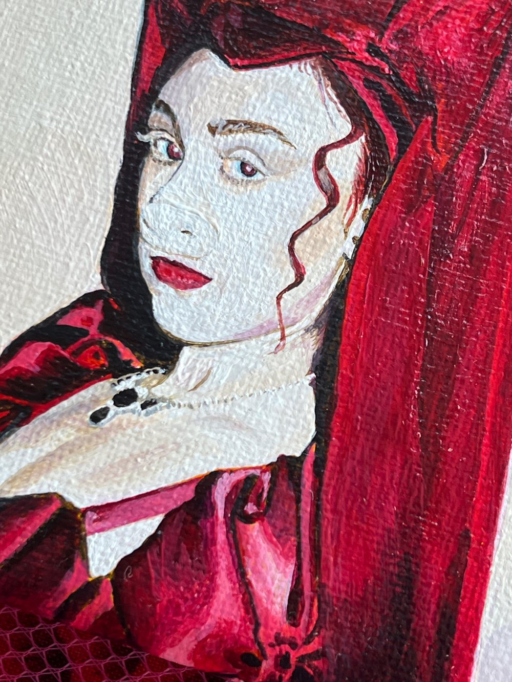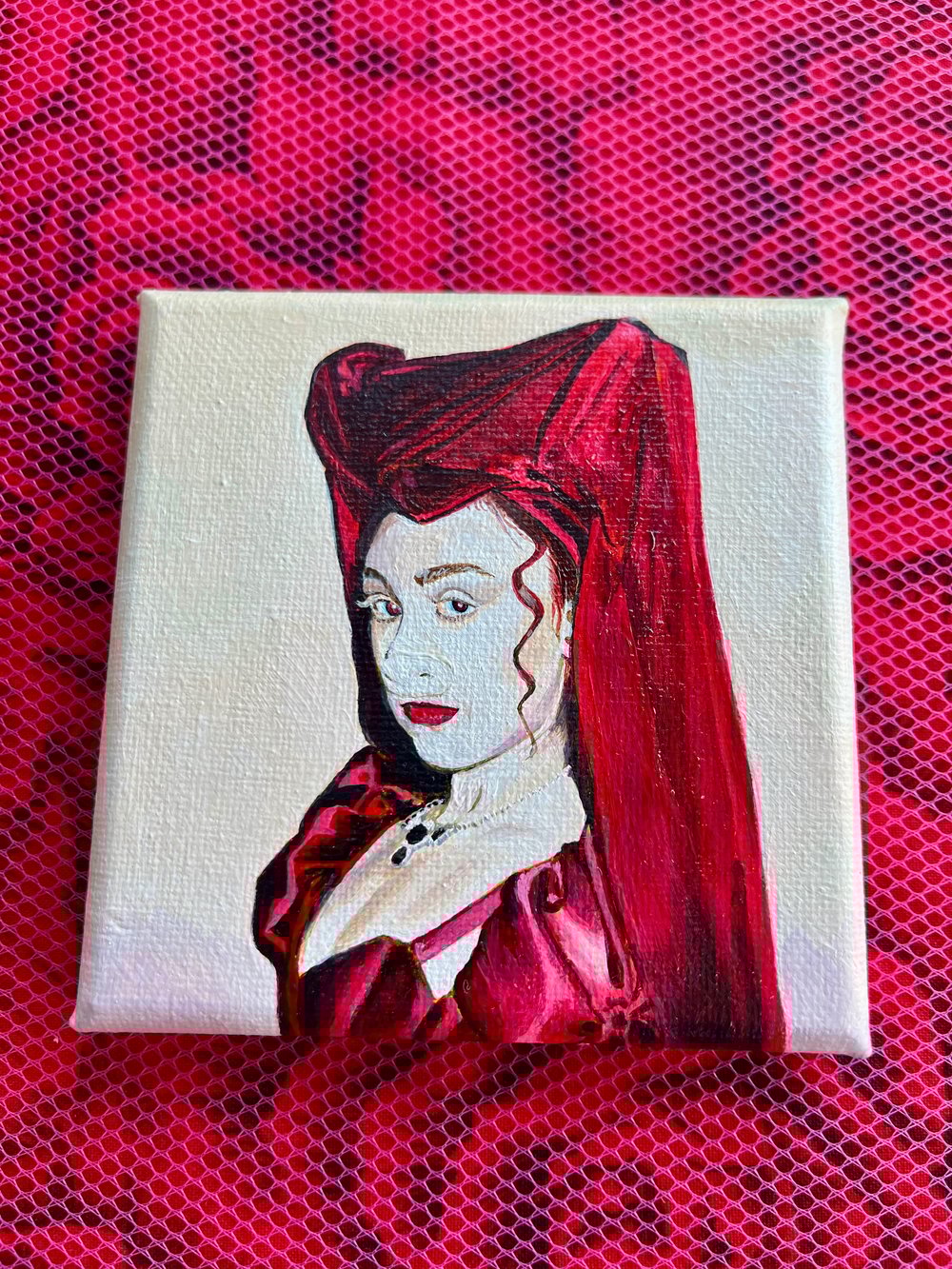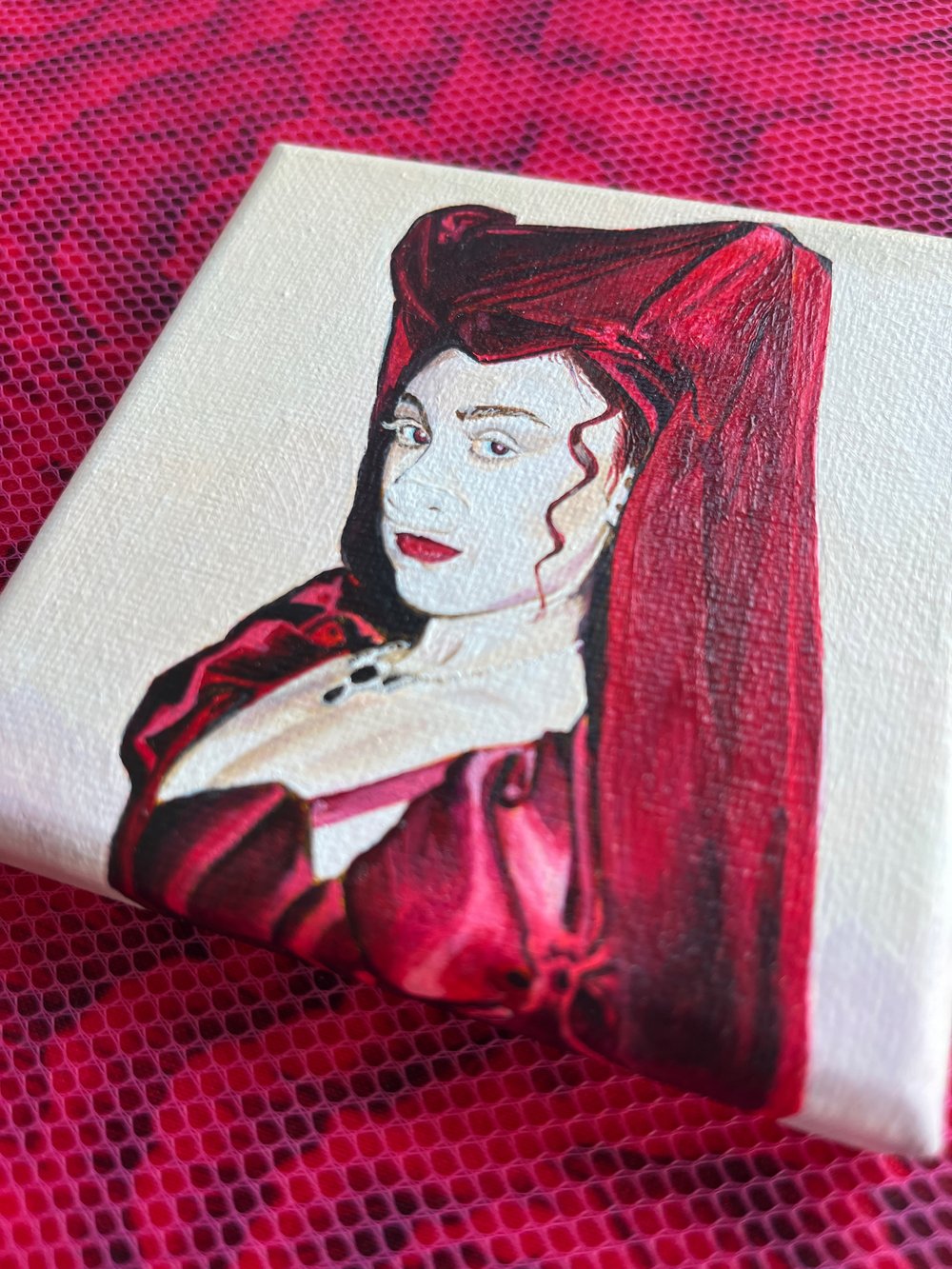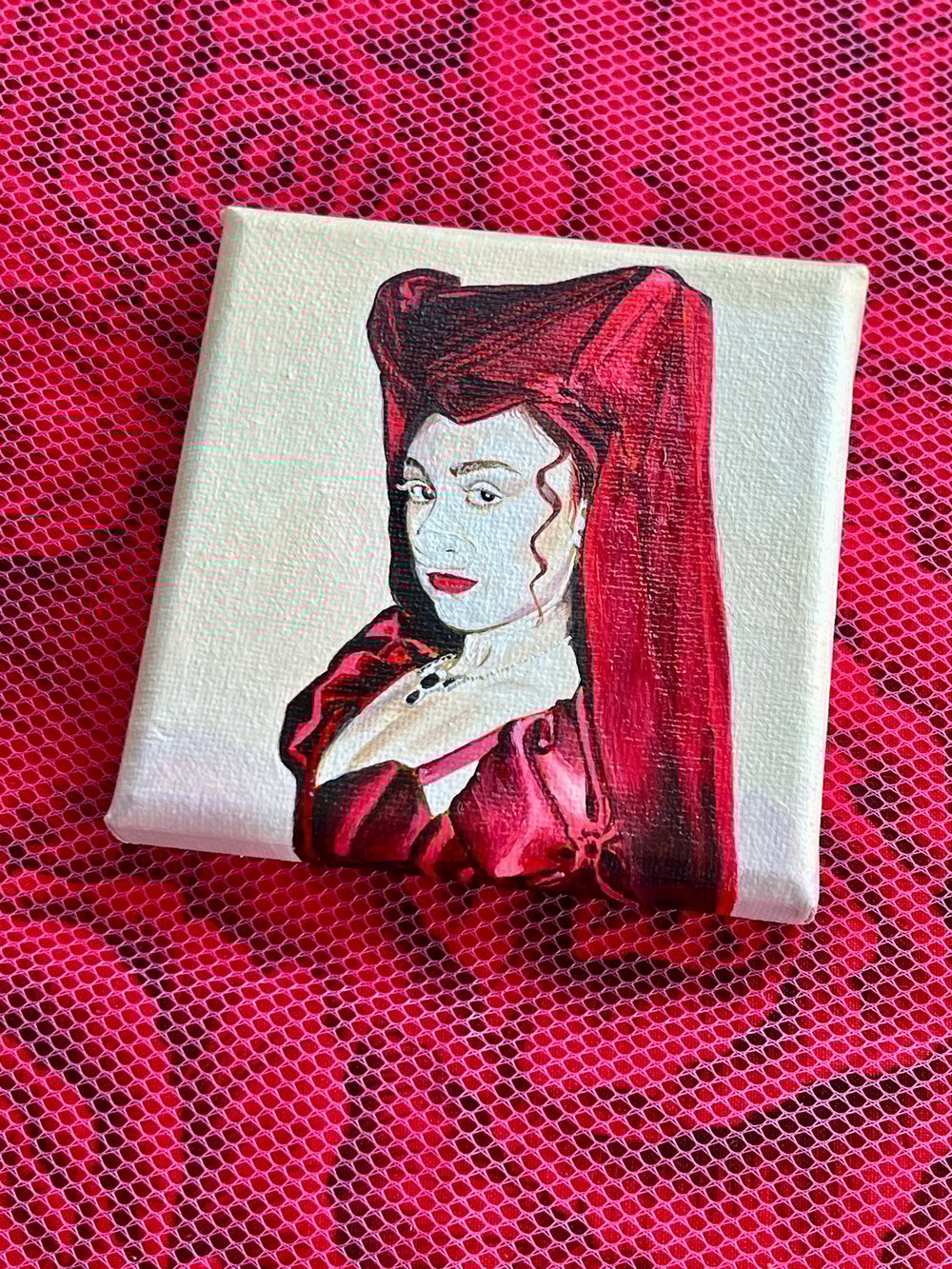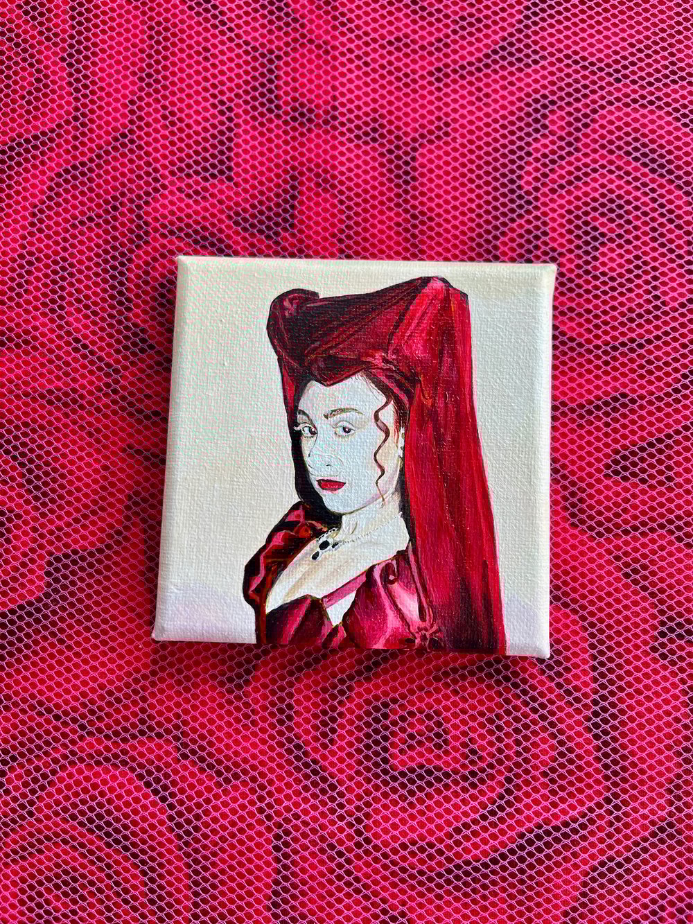 4" square acrylic painting of Chappell Roan's "Good Luck, Babe!" single artwork, which has been sealed with a semi-gloss varnish to preserve color and detail.