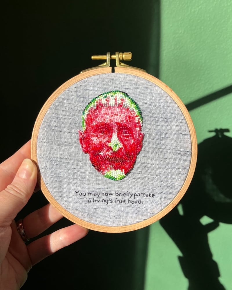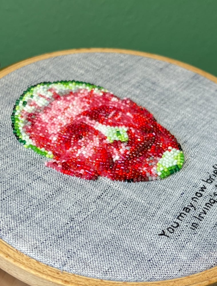 Bead embroidery of Irving B’s honorary carved watermelon likeness from Severance.