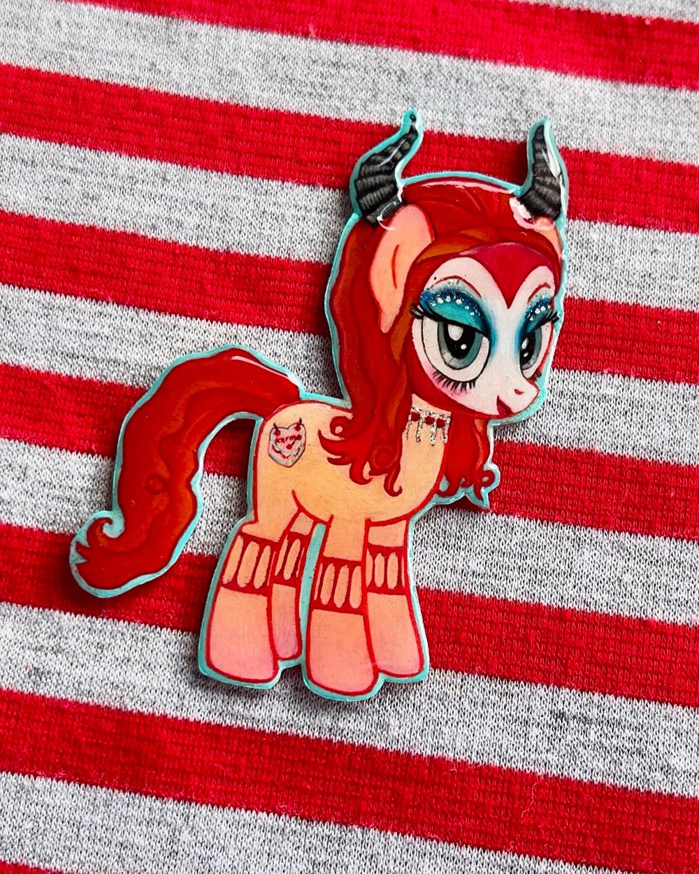 I took my inspiration from Chappell's My Kink is Karma video and incorporated the horns, makeup, cutie mark and body details to make this piece! I paid special attention to the makeup, and combined silver ink, nail polish and glitter to get it just right.