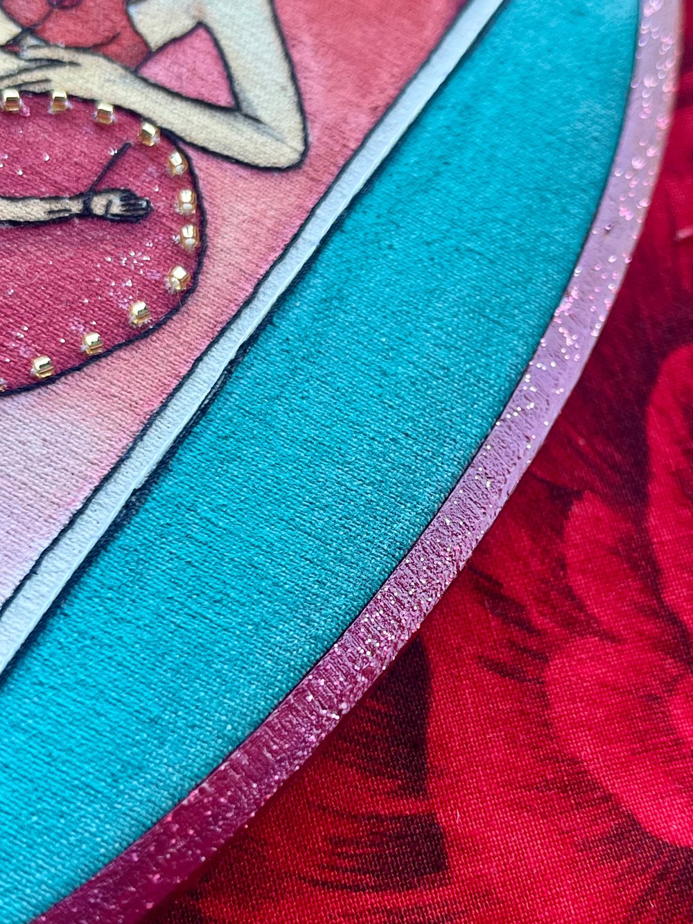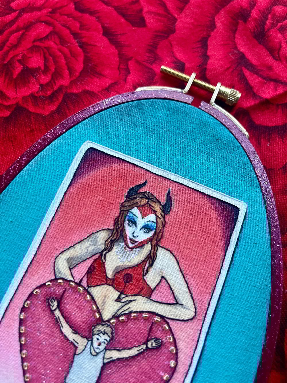 This piece combines watercolor, blackwork embroidery and beading on canvas and is mounted in a 8"x5" oval embroidery hoop that has been painted with dark red and clear sparkle paint.