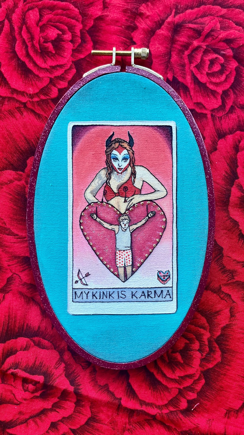 I used Chappell's My Kink Is Karma video and the Rider-Waite 'The Devil' tarot to create this embroidered image.