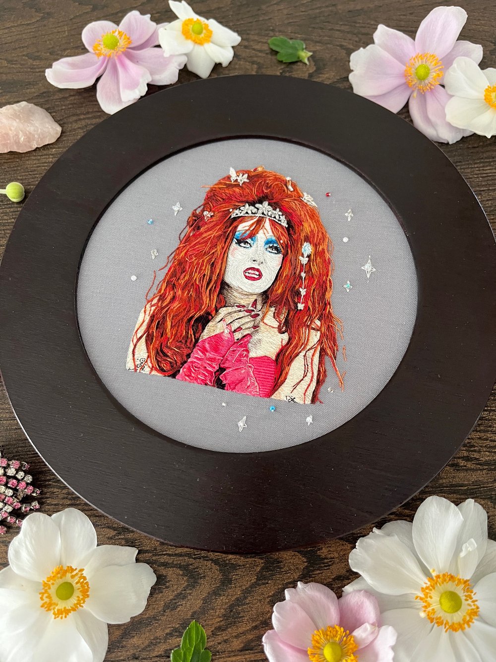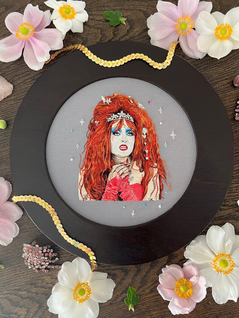 This Chappell Roan portrait is of her look from her Tiny Desk Concert. She is stitched on grey Kona cotton with DMC embroidery floss and finished in a 6" Nurge wooden hoop and Modern Hoopla stained round frame. I also incorporated beads in her crown and on some little sparkly embellishments. This was a true labor of love and I hope you enjoy it!